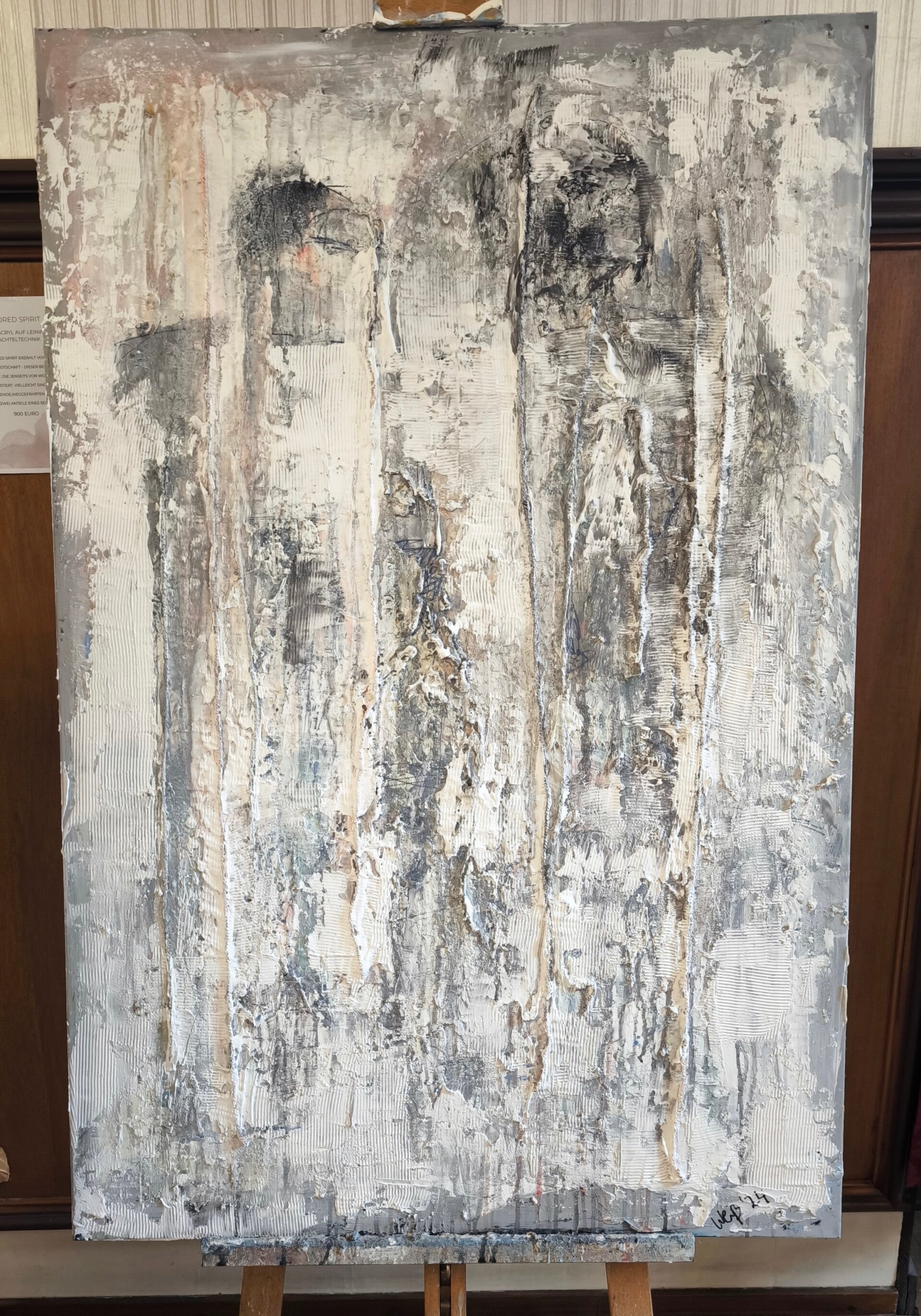 Zwei schemenhafte Gestalten, kaum greifbar, und doch ist ihre Verbindung spürbar, Inmitten der abstrakten Formen und zarten Übergängen offenbart sich eine stille Nähe.